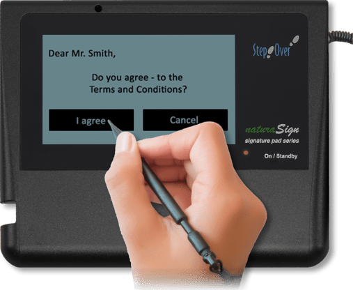 With the launch of StepOver naturaSign Pad Economy, the StepOver development team have noted down the growing trend for ever-larger displays to enable convenient, easy handling. The naturaSign Pad Economy is specifically developed for the requirement of mobile usage, including field sales. Thanks to the large black-and-white screen, the super-slim design (0,95 cm thick) and its curved edges, the naturaSign Pad Economy is also an extremely compact, yet sturdy and comfortable, device for signature capture.