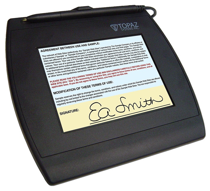 Topaz SigGem® Color 5.7 (T-LBK57GC-BBSB-R) is an advanced biometric electronic signature pad with 5.7 inches, full-color TFT VGA (640×480) LCD that captures and displays “electronic ink” under the pen tip for a natural signature.